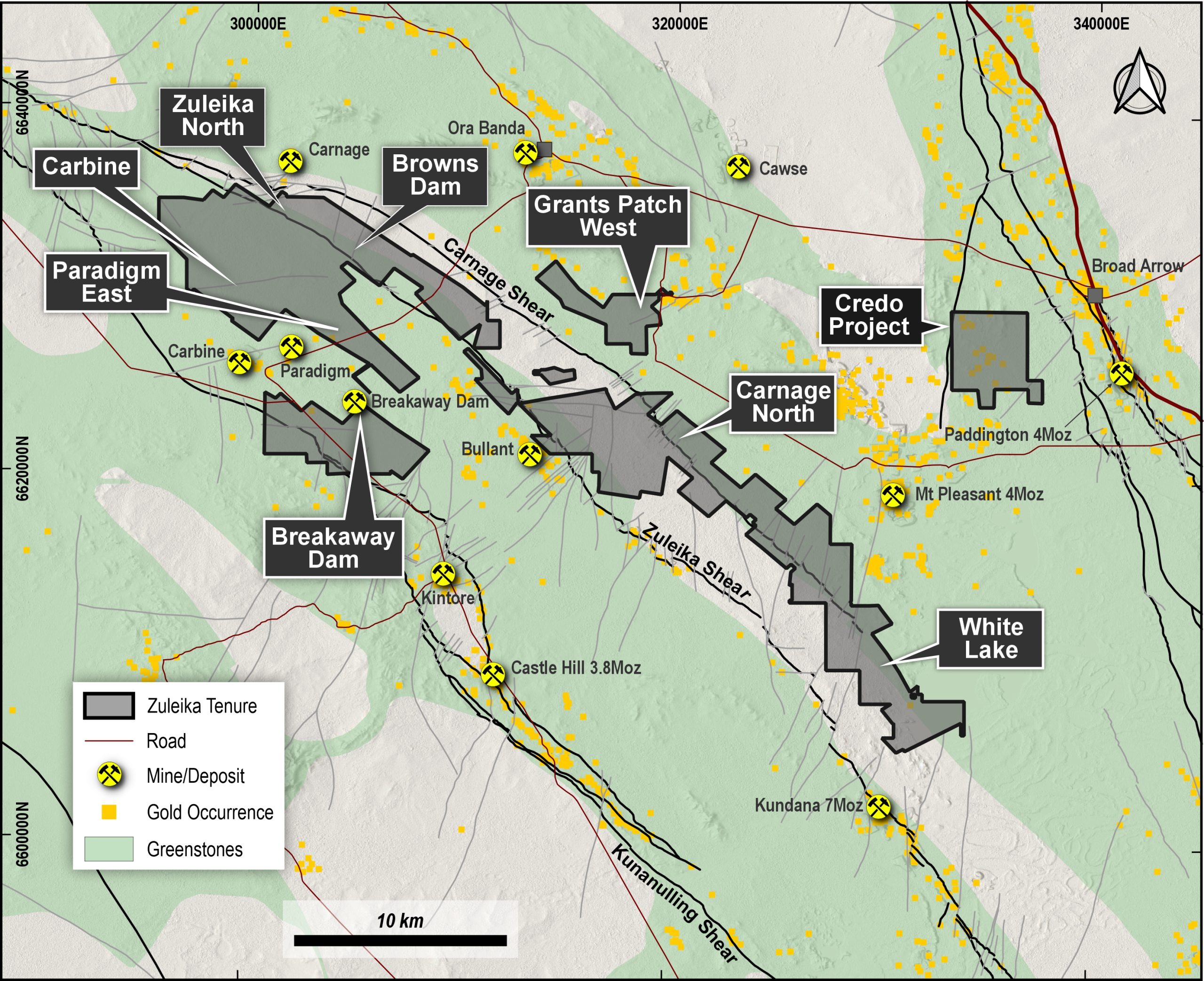 Zuleika Gold has two joint ventures on the world class gold conduit, the Zuleika Shear (220 km²) which has produced 20 million ounces of gold and at Credo Well (12 km²) which historically has shown spectacular specimen gold and from drilling generated extraordinary high-grade intersections. The Zuleika and Credo areas are adjacent to a number of producing gold mines operated by Northern Star, Evolution and Zijin.